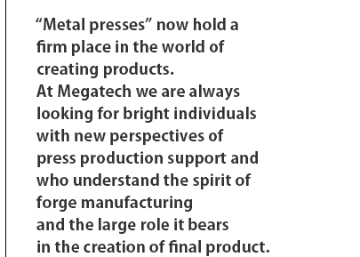 | Megatech began as a distributor of just a select number of press makers within Japan and to this day we continue to stand by our strong sense of customer service. We are dedicated to a constant spirit of creativity and planning and creation of varied services which will contribute to the positive growth to the company without being distracted by what is considered to be the status quo. It is this dedication which has led us to where we are now as a well respected press machinery distributor and maker with a very unique standing in our business community. It is by continuing to challenge ourselves in every way that we will continue to expand in a sustainable fashion as we continue to expand in the international arena. |