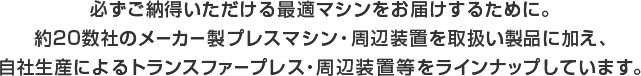 | アイダ、コマツの大手メーカー製プレスから特殊プレス、自社生産による各種トランスファープレス機まで幅広いプレス機械を取り扱っております。 |