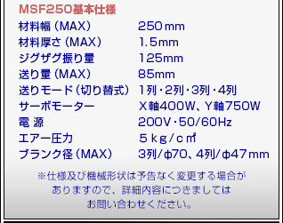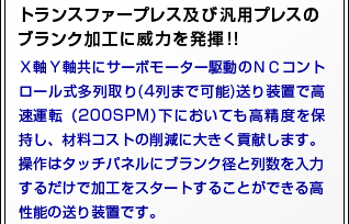 | メガテックオリジナルの周辺装置といたしましては、現在、X軸Y軸共にサーボモーター駆動によるNCコントロール式での多列取が可能な材料送り装置「MSFシーズ」を販売させていただいております。当社製高速トランスファープレス機「MTPシリーズ」への装着を前提に開発した商品ですが、汎用プレス機のブランク加工にも威力を発揮しコスト削減に寄与することから好評な商品です。 |