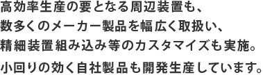 | また、生産プラン・工程の更なる生産性向上・高効率化を求められるケースでは、既成製品に、メカニカル精密フィンガー、サーボ駆動、感知センサーなど装置を取り付ける等のカスタマイズも実施させていただき、どうしても既成製品では適しないケースでは、オーダーメイドにより一から設計製作した装置をお届けいたします(※オーダーメイドマシンページをご参照ください)。 |